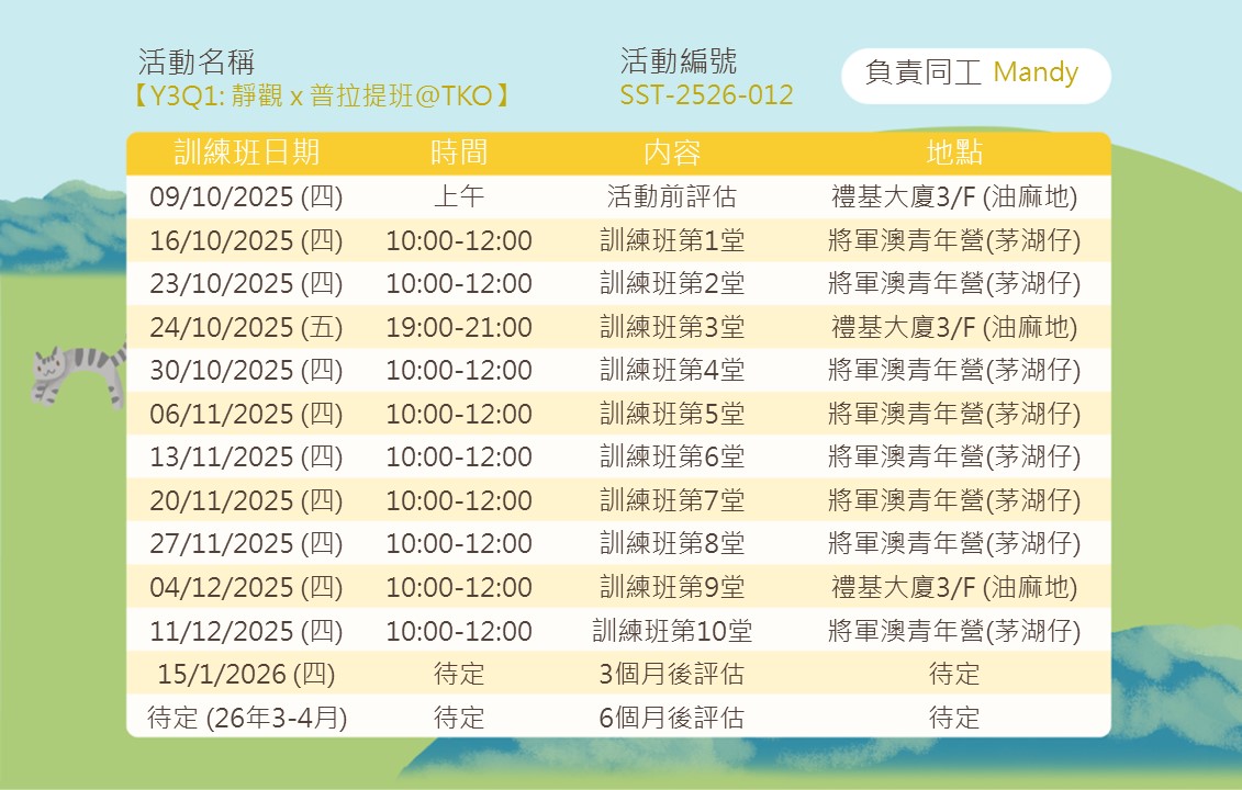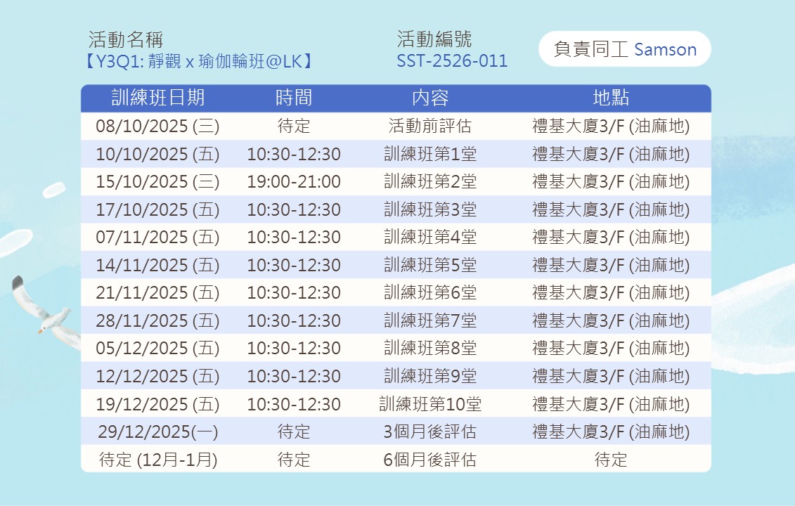 內容:透過靜觀運動及體驗,提升身心靈的和諧。透過專注當下、舒展身體、平靜思緒,培養自我覺察、減壓放鬆、提高靈活性和內在平衡。