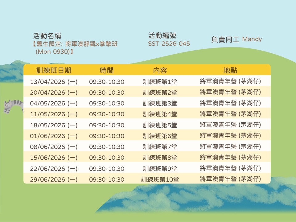 活動內容:拳擊是全身協調能力的運動,有助加強反應力、平衡力、心肺功能及肌耐力,非常有益身心的帶氧運動之一。