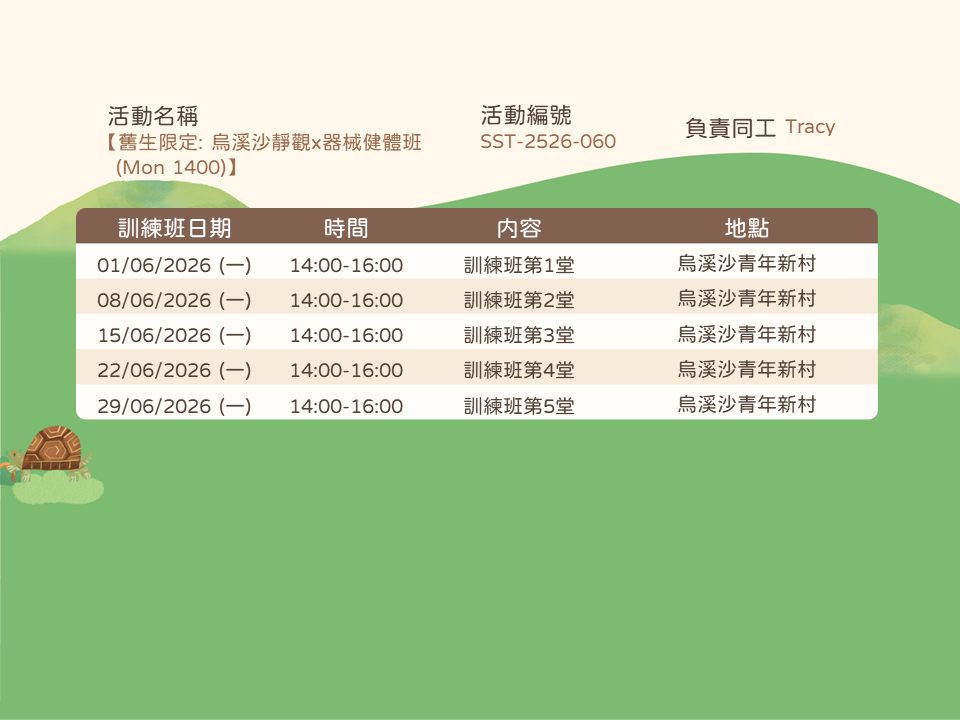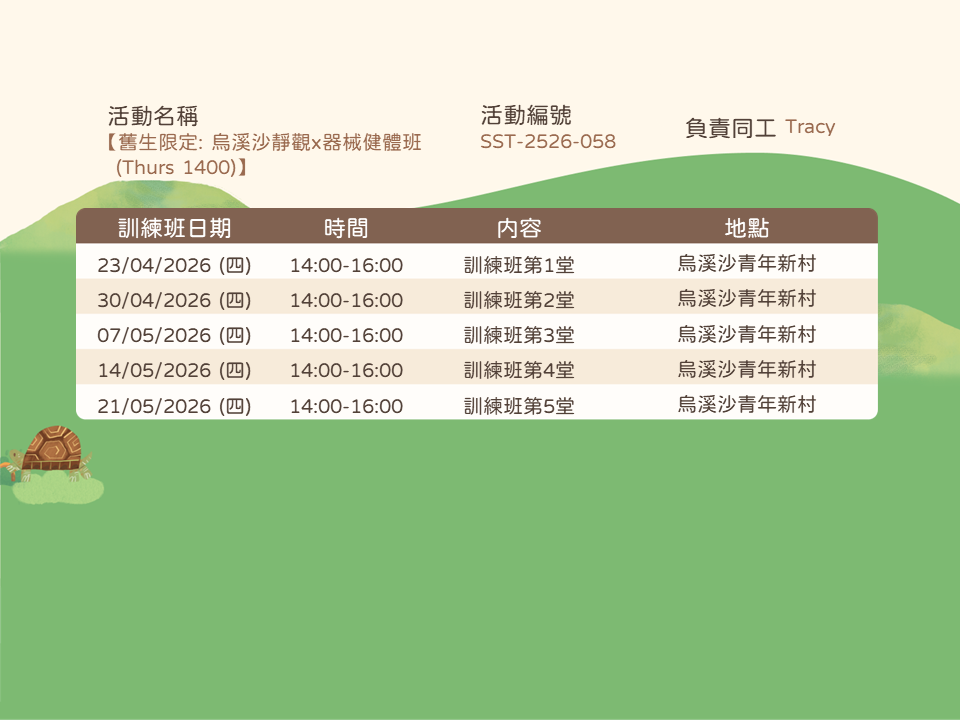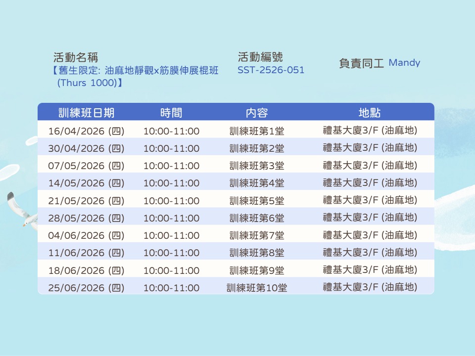 內容:透過靜觀運動及體驗,提升身心靈的和諧。透過專注當下、舒展身體、平靜思緒,培養自我覺察、減壓放鬆、提高靈活性和內在平衡